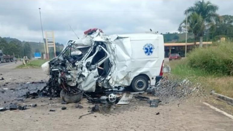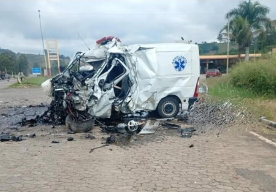 Uma ambulância da Prefeitura de Divino colidiu de frente com uma carreta, causando a morte imediata do motorista do veículo oficial.